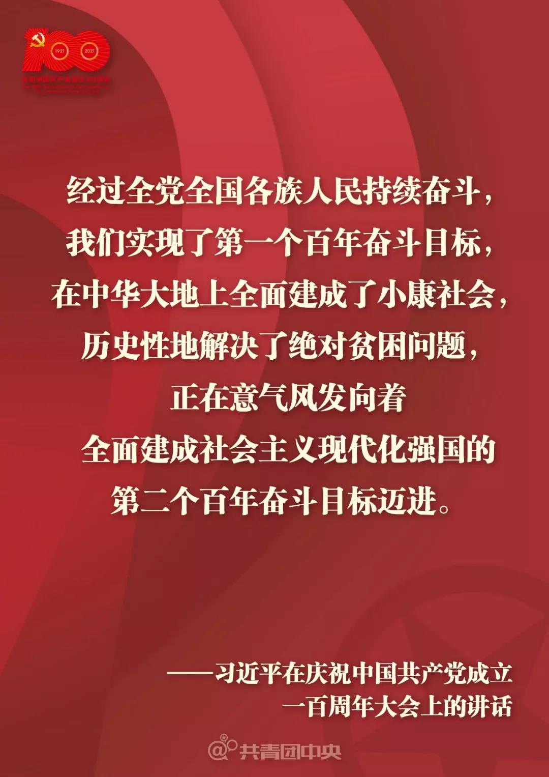 在过去的100年里,中国共产党紧紧依靠人民,跨过一道又一道沟坎,取得一个又一个胜利;在未来的100年里,我们更要为之努力。祖国的未来在我们手中,让我们在新的征程上,以史为鉴,开创未来!把青年奋斗融入党的奋斗事业,不负时代,不负韶华,不负党和人民的殷切希望。