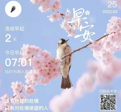 为了与不良作息作“斗争”,各位健康“守护侠”纷纷调好闹钟,登上“规律作息”的班车,争先恐后地发出 “说过要早睡早起,所以我先睡为敬”的宣言。早睡早起是否让同学们感觉神清气爽?制定一天计划是否让同学们有了“与时间赛跑”的feel?看到健康“守护侠”坚持的成果,不禁要为你们点个赞!