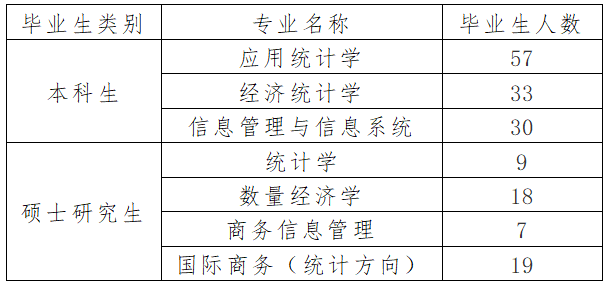 统计与信息学院奉行“理工固本、经贸铸魂”的办学理念,将先进的信息技术、统计和数学方法与外经贸实务相结合,学科特色鲜明,行业应用广泛。学院拥有应用统计学、经济统计学、信息管理与信息系统、数据科学与大数据技术4个本科专业,创建了全国首个“贸易统计创新实验班”;拥有统计学理学一级学科硕士点;数量经济学、统计学、商务信息管理3个二级学科学术型硕士点;应用统计学和国际商务(国际商务统计方向)2个专业学位硕士点。十多年来,学院向社会各界输送了一批批高素质人才,许多毕业生进入IBM、腾讯、京东、“四大”银行等世界五百强企业就职,到耶鲁大学、哥伦比亚大学、约翰霍普金斯大学、杜克大学、加州大学、浙江大学、上海交通大学等世界名校深造。