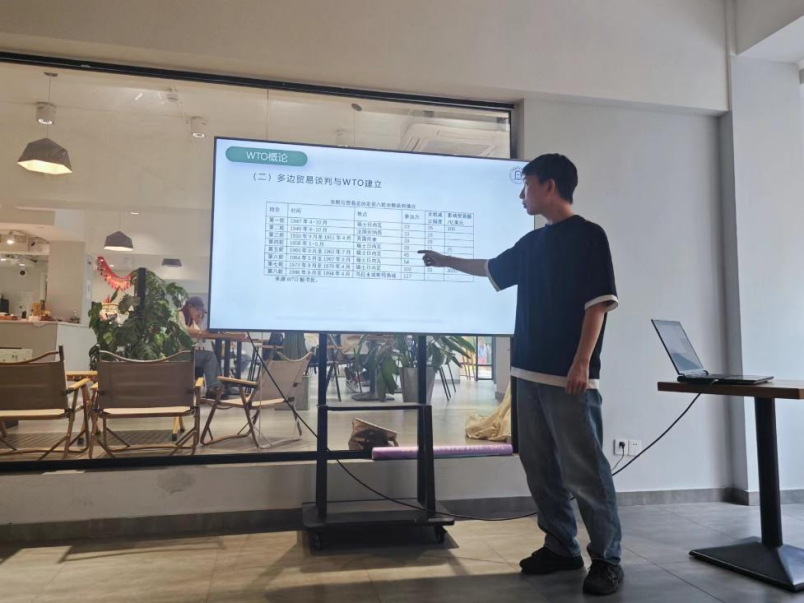 国际组织学院(贸易谈判学院)在读博士生宋喜志通过“WTO与国际贸易理论”对WTO框架进行了梳理。他通过鲜活的案例,生动地引入了比较优势理论,为同学们揭示了国际贸易的基石。他详细阐述了世界贸易组织的建立过程,以及非歧视原则在维护国际贸易公平中的核心作用。在货物贸易领域,他深入剖析了关税壁垒和非关税壁垒对国际贸易的影响,并介绍了贸易救济制度的重要性。