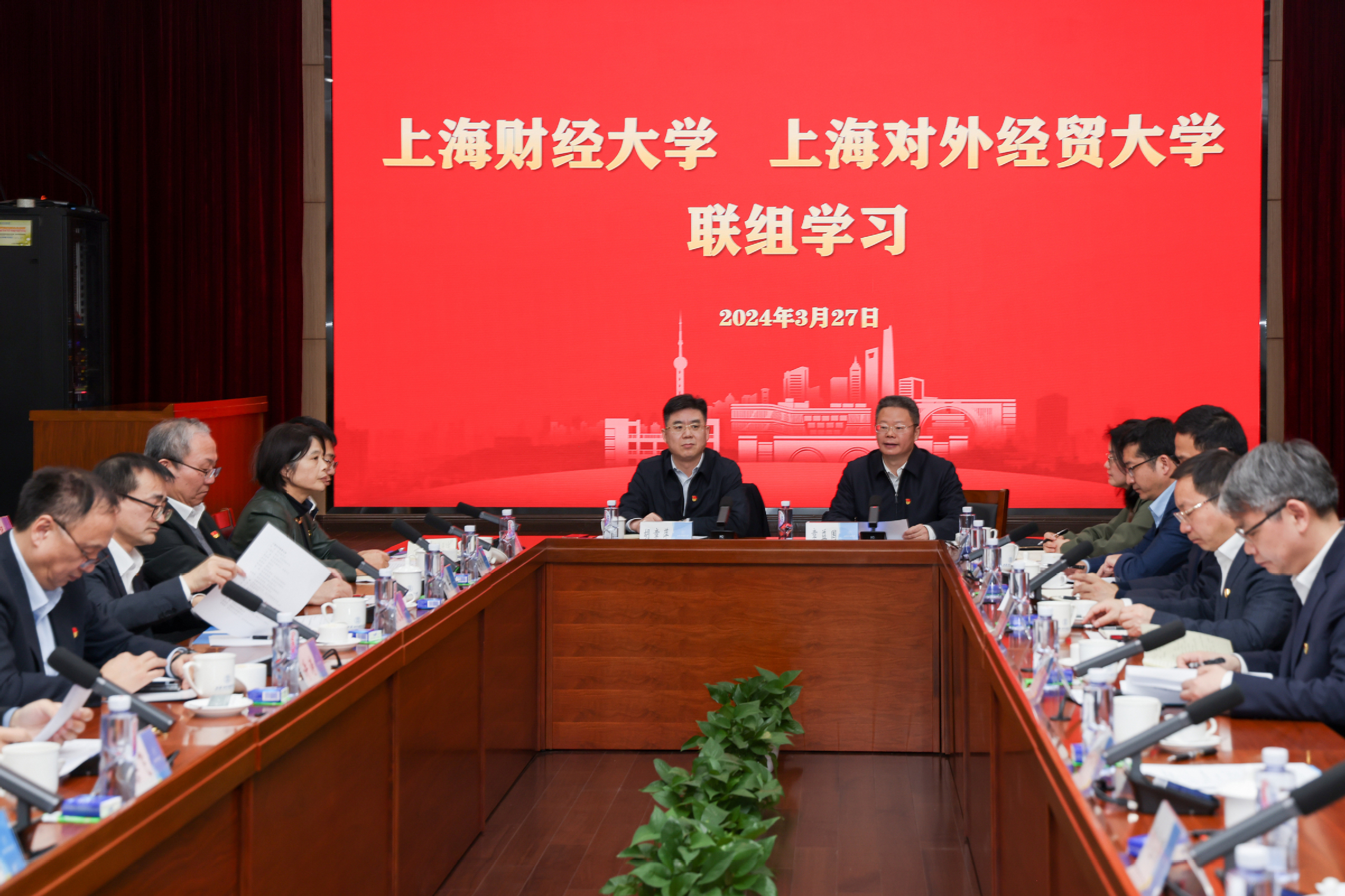 3月27日下午,上海财经大学与上海对外经贸大学战略签约暨联组学习活动在上海对外经贸大学长宁校区举行。上海财经大学党委书记许涛、校长刘元春、校领导班子成员以及相关单位负责人,上海对外经贸大学党委书记祁明、校长汪荣明、校领导班子成员以及相关单位负责人出席活动。上海对外经贸大学副校长徐永林,党委副书记、纪委书记章益国先后主持签约仪式暨联组学习。